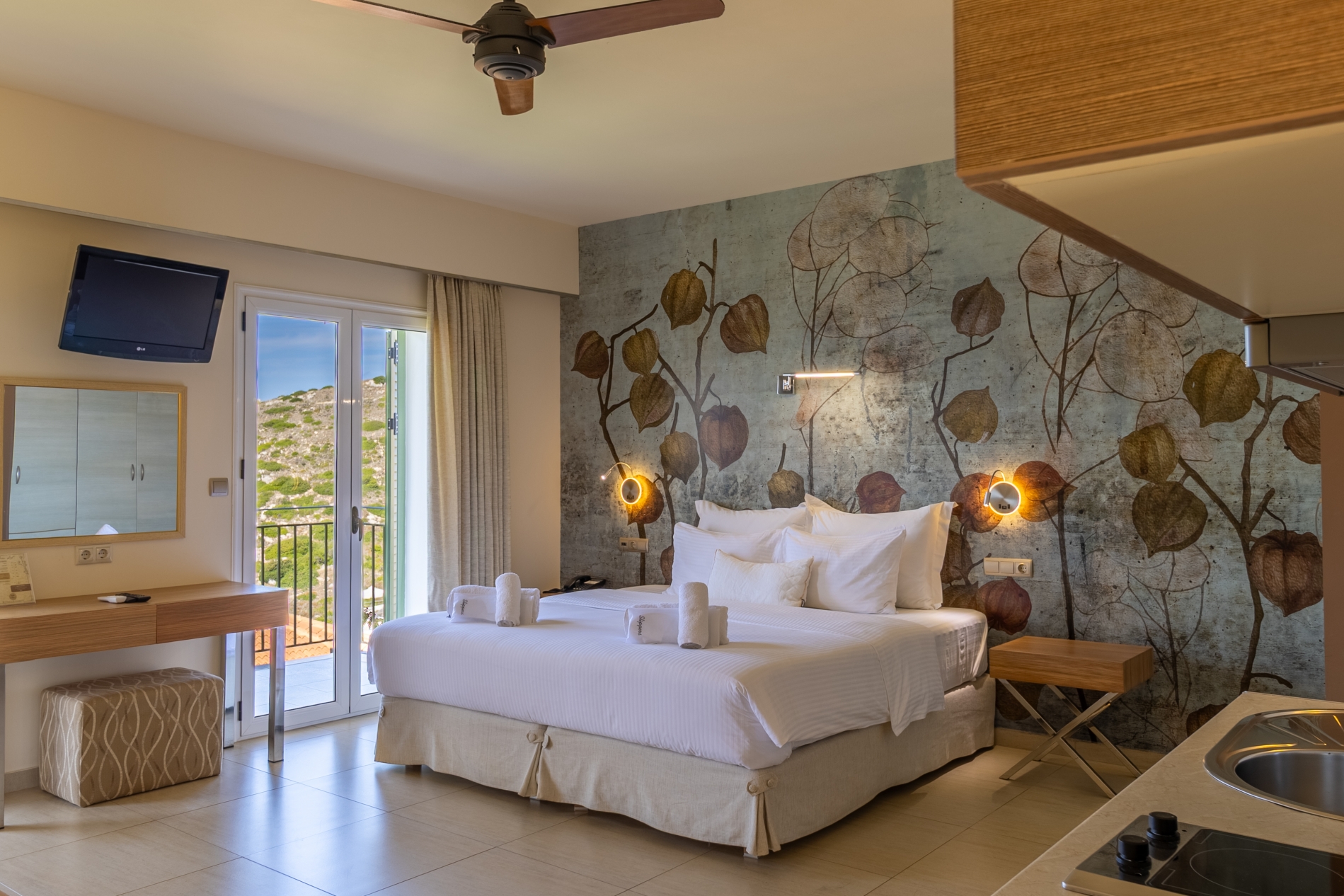 Enjoy your stay at our Junior Suite, in an ample space designed to meet the highest standards of comfort. Located on the higher ground floor, the suite is modernly furnished and fully equipped with Wi-Fi, Netflix and A/C, offering a wonderful retreat for our valued guests. The suite comes with a private balcony boasting impressive views to the endless sea and the majestic sunset. Within proximity from the parking lot and the olive groves, this is a greatly accessible accommodation option for you.